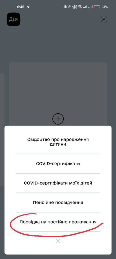 Торцом телефона, примерно, 45 градусов к посвидке, прислоняем телефон и держим не убираем, пока не считает. Телефоном не елозим, не убираем от посвидки.Если у Вас посвидка не подтянулась в ДИЮ автоматически, то выбираем в меню дии пункт “Додати документ” (он находится после всех карточек с документами):